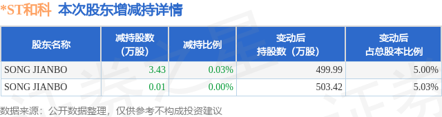 证券之星消息,1月6日*ST和科发布公告《*ST和科:关于持股5%以上股东减持至5%以下及权益变动触及1%整数倍暨披露简式权益变动报告书的提示性公告》,其股东SONG JIANBO于2025年11月14日至2026年1月5日间合计减持3.44万股,占公司目前总股本的0.0344%,变动期间该股股价上涨0.39%,截止1月5日收盘报23.19元。