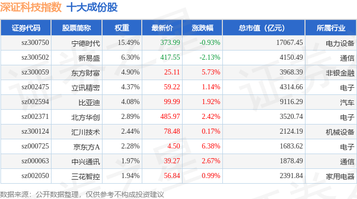 深证科技(399339)指数十大成份股详情如下: