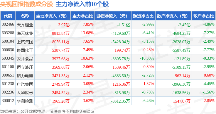 资金流向方面,央视回报(399553)指数成份股当日主力资金净流出合计23.48亿元,游资资金净流入合计9.23亿元,散户资金净流入合计14.25亿元。成份股资金流向详情见下表: