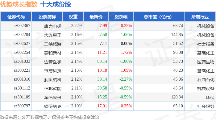 证券之星消息,1月6日,优势成长(399698)指数报收于53190.84点,涨0.57%,成交91.24亿元,换手率2.59%。当日该指数成份股中,上涨的有37家,绿联科技以4.51%的涨幅领涨,下跌的有11家,匠心家居以4.12%的跌幅领跌。