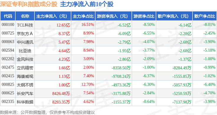 资金流向方面,深证专利R(470067)指数成份股当日主力资金净流入合计11.07亿元,游资资金净流出合计13.98亿元,散户资金净流入合计2.91亿元。成份股资金流向详情见下表: