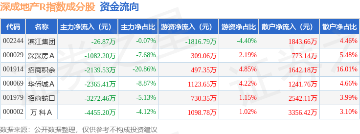 资金流向方面,深成地产R(471001)指数成份股当日主力资金净流出合计1.33亿元,游资资金净流入合计1942.41万元,散户资金净流入合计1.14亿元。成份股资金流向详情见下表:
