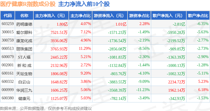 资金流向方面,医疗健康R(480016)指数成份股当日主力资金净流出合计4.71亿元,游资资金净流入合计2.71亿元,散户资金净流入合计2.0亿元。成份股资金流向详情见下表: