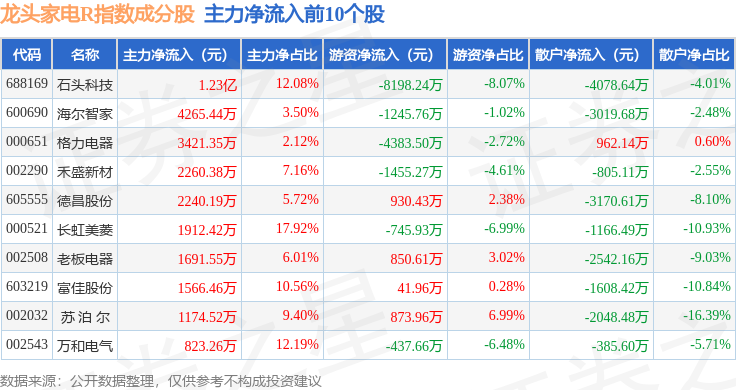 资金流向方面,龙头家电R(480028)指数成份股当日主力资金净流出合计7.74亿元,游资资金净流入合计2.11亿元,散户资金净流入合计5.62亿元。成份股资金流向详情见下表: