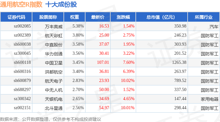 通用航空R(480076)指数十大成份股详情如下: