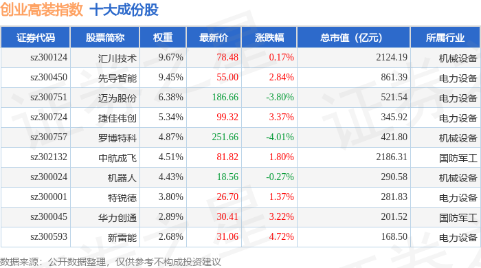 创业高装(970040)指数十大成份股详情如下: