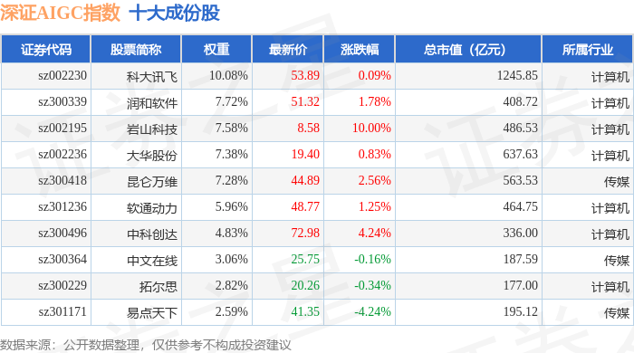 深证AIGC(970075)指数十大成份股详情如下: