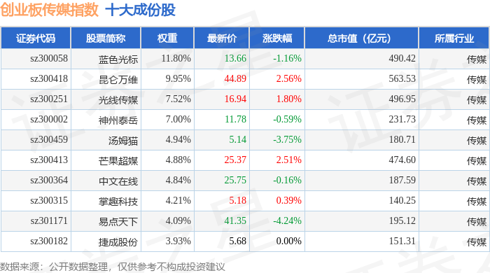 创业板传媒(970084)指数十大成份股详情如下: