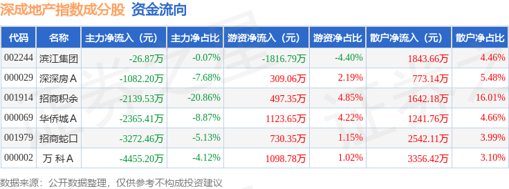 资金流向方面,深成地产(971001)指数成份股当日主力资金净流出合计1.33亿元,游资资金净流入合计1942.41万元,散户资金净流入合计1.14亿元。成份股资金流向详情见下表: