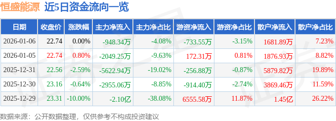 证券之星消息,截至2026年1月6日收盘,恒盛能源(605580)报收于22.74元,上涨0.0%,换手率3.64%,成交量10.2万手,成交额2.33亿元。