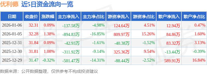 证券之星消息,截至2026年1月6日收盘,优利德(688628)报收于32.31元,上涨0.09%,换手率0.77%,成交量8564.0手,成交额2763.87万元。