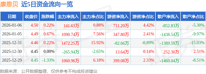 1月6日的资金流向数据方面,主力资金净流入141.63万元,占总成交额0.88%,游资资金净流入711.2万元,占总成交额4.42%,散户资金净流出852.83万元,占总成交额5.3%。