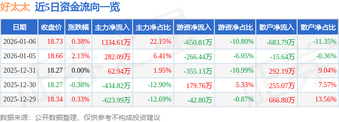 1月6日的资金流向数据方面,主力资金净流入1334.61万元,占总成交额22.15%,游资资金净流出650.81万元,占总成交额10.8%,散户资金净流出683.79万元,占总成交额11.35%。