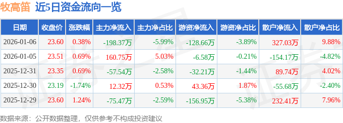 证券之星消息,截至2026年1月6日收盘,牧高笛(603908)报收于23.6元,上涨0.38%,换手率1.5%,成交量1.4万手,成交额3309.16万元。