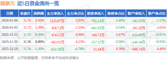 证券之星消息,截至2026年1月6日收盘,健康元(600380)报收于11.76元,上涨0.43%,换手率1.05%,成交量19.12万手,成交额2.24亿元。