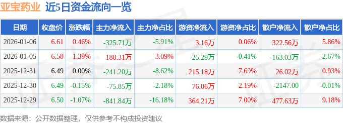 证券之星消息,截至2026年1月6日收盘,亚宝药业(600351)报收于6.61元,上涨0.46%,换手率1.21%,成交量8.34万手,成交额5506.68万元。