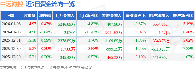 1月6日的资金流向数据方面,主力资金净流出5246.89万元,占总成交额4.82%,游资资金净流出407.98万元,占总成交额0.37%,散户资金净流入5654.86万元,占总成交额5.19%。