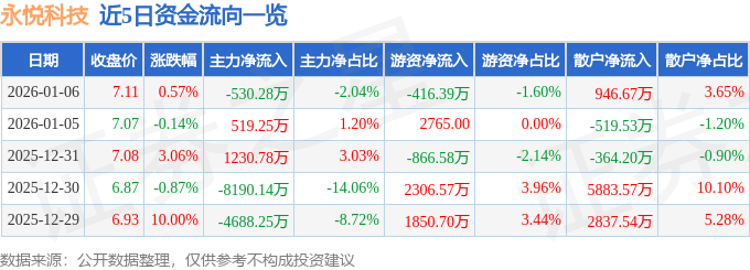 证券之星消息,截至2026年1月6日收盘,永悦科技(603879)报收于7.11元,上涨0.57%,换手率10.24%,成交量36.79万手,成交额2.6亿元。