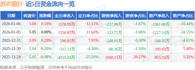 证券之星消息,截至2026年1月6日收盘,苏农银行(603323)报收于5.08元,上涨0.59%,换手率1.28%,成交量25.75万手,成交额1.3亿元。