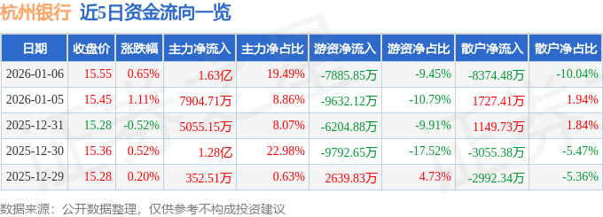 证券之星消息,截至2026年1月6日收盘,杭州银行(600926)报收于15.55元,上涨0.65%,换手率0.75%,成交量54.06万手,成交额8.34亿元。