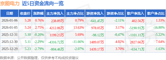 证券之星消息,截至2026年1月6日收盘,京能电力(600578)报收于5.28元,上涨0.76%,换手率0.86%,成交量57.53万手,成交额3.03亿元。