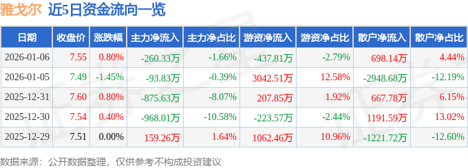 证券之星消息,截至2026年1月6日收盘,雅戈尔(600177)报收于7.55元,上涨0.8%,换手率0.45%,成交量20.85万手,成交额1.57亿元。