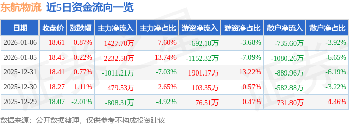 1月6日的资金流向数据方面,主力资金净流入1427.7万元,占总成交额7.6%,游资资金净流出692.1万元,占总成交额3.68%,散户资金净流出735.6万元,占总成交额3.92%。