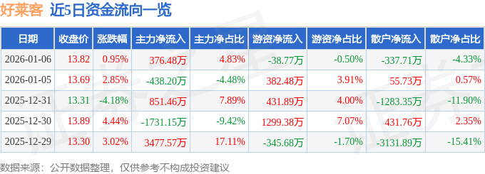 1月6日的资金流向数据方面,主力资金净流入376.48万元,占总成交额4.83%,游资资金净流出38.77万元,占总成交额0.5%,散户资金净流出337.71万元,占总成交额4.33%。