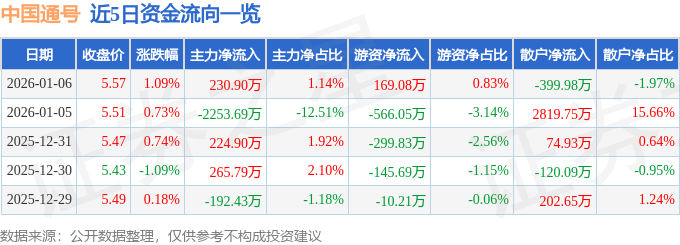 1月6日的资金流向数据方面,主力资金净流入230.9万元,占总成交额1.14%,游资资金净流入169.08万元,占总成交额0.83%,散户资金净流出399.98万元,占总成交额1.97%。