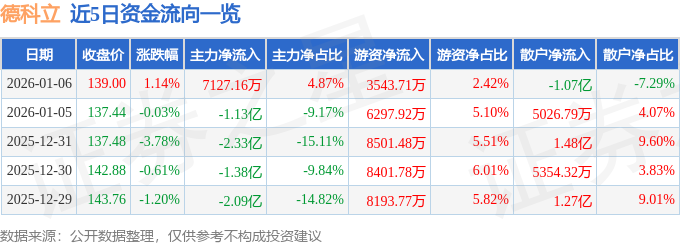 证券之星消息,截至2026年1月6日收盘,德科立(688205)报收于139.0元,上涨1.14%,换手率6.72%,成交量10.64万手,成交额14.63亿元。
