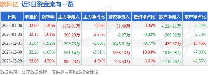 证券之星消息,截至2026年1月6日收盘,欧科亿(688308)报收于32.6元,上涨1.4%,换手率2.86%,成交量4.54万手,成交额1.49亿元。