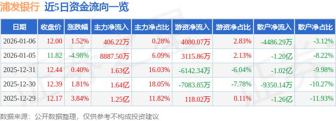 证券之星消息,截至2026年1月6日收盘,浦发银行(600000)报收于12.0元,上涨1.52%,换手率0.36%,成交量121.38万手,成交额14.4亿元。