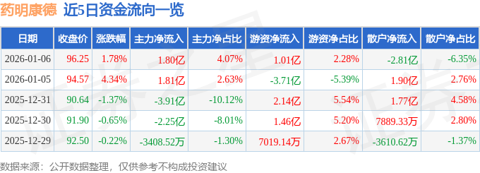 1月6日的资金流向数据方面,主力资金净流入1.8亿元,占总成交额4.07%,游资资金净流入1.01亿元,占总成交额2.28%,散户资金净流出2.81亿元,占总成交额6.35%。