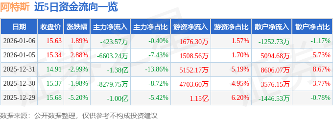 证券之星消息,截至2026年1月6日收盘,阿特斯(688472)报收于15.63元,上涨1.89%,换手率5.08%,成交量68.47万手,成交额10.69亿元。
