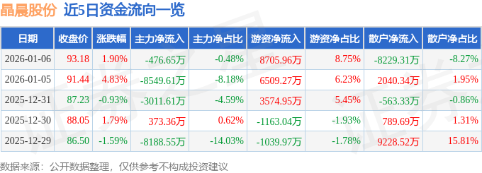 1月6日的资金流向数据方面,主力资金净流出476.65万元,占总成交额0.48%,游资资金净流入8705.96万元,占总成交额8.75%,散户资金净流出8229.31万元,占总成交额8.27%。