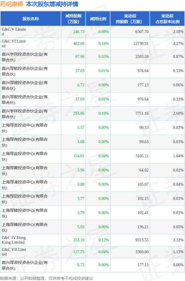 证券之星消息,1月6日药明康德发布公告《药明康德:股东减持股份结果公告》,其股东G&C V Limited、G&C VI Limited、G&C VII Limited、G&C IV Hong Kong Limited、上海厚雍投资中心(有限合伙)、上海厚辕投资中心(有限合伙)、上海厚玥投资中心(有限合伙)、上海厚溱投资中心(有限合伙)、上海厚菱投资中心(有限合伙)、上海厚燊投资中心(有限合伙)、上海厚尧投资中心(有限合伙)、上海厚嵩投资中心(有限合伙)、嘉兴宇祥投资合伙企业(有限合伙)、嘉兴厚毅投资合伙企业(有限合伙)、嘉兴厚锦投资合伙企业(有限合伙)、嘉兴厚毓投资合伙企业(有限合伙)、嘉兴宇民投资合伙企业(有限合伙)、嘉兴厚咨投资合伙企业(有限合伙)于2025年12月18日至2026年1月5日间合计减持1833.85万股,占公司目前总股本的0.6147%,变动期间该股股价上涨4.39%,截止1月5日收盘报94.57元。