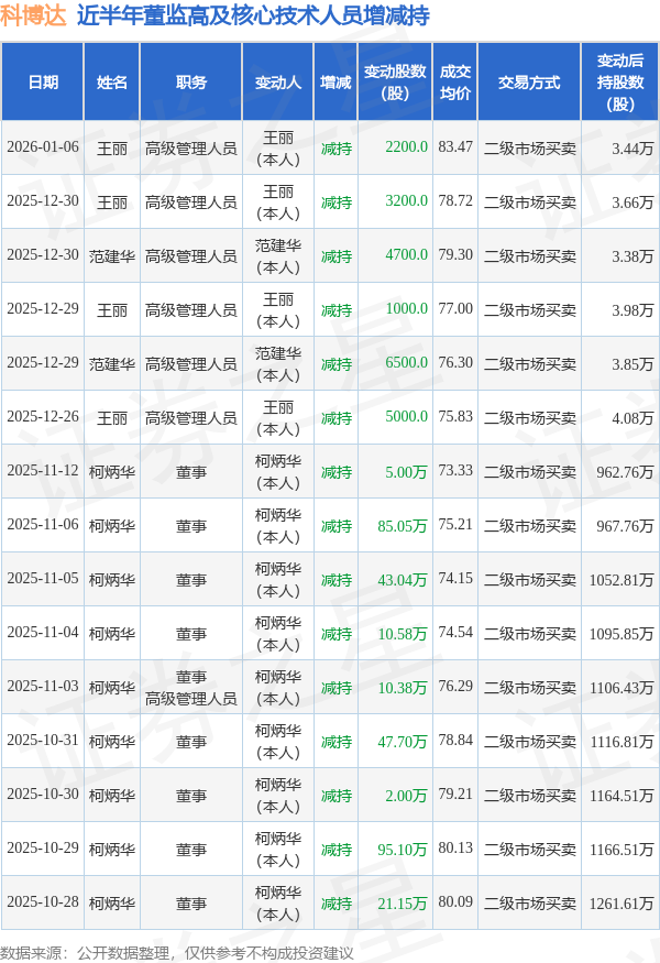 科博达近半年内的董监高及核心技术人员增减持详情如下: