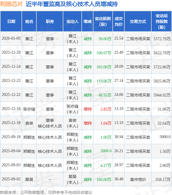 利扬芯片近半年内的董监高及核心技术人员增减持详情如下: