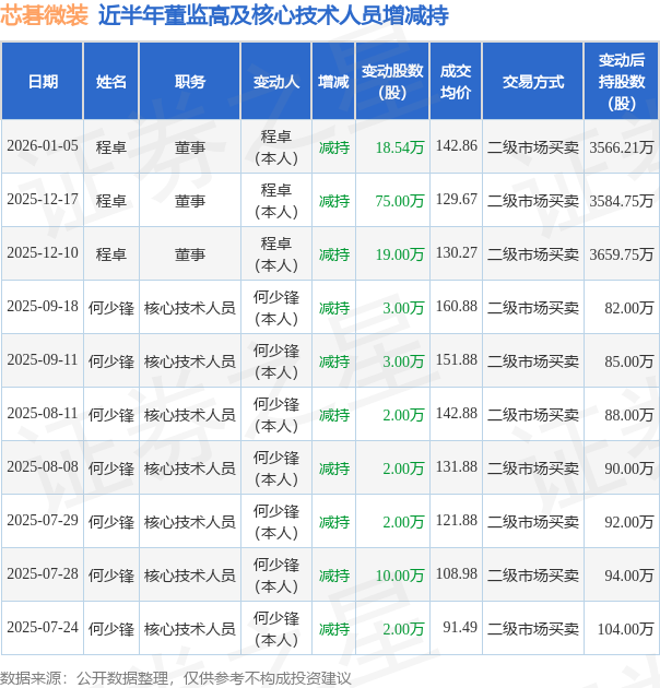 芯碁微装近半年内的董监高及核心技术人员增减持详情如下: