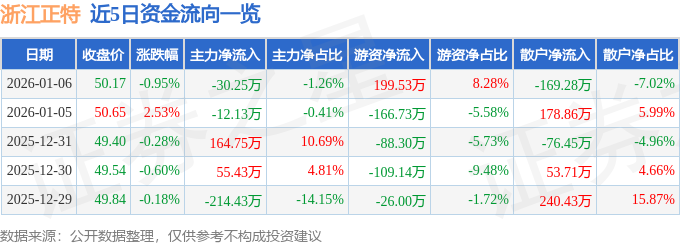 证券之星消息,截至2026年1月6日收盘,浙江正特(001238)报收于50.17元,下跌0.95%,换手率0.46%,成交量4777.0手,成交额2410.09万元。
