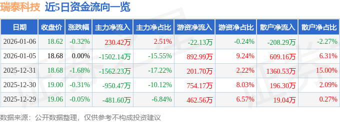 证券之星消息,截至2026年1月6日收盘,瑞泰科技(002066)报收于18.62元,下跌0.32%,换手率2.11%,成交量4.88万手,成交额9180.86万元。