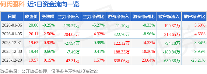 证券之星消息,截至2026年1月6日收盘,何氏眼科(301103)报收于20.06元,下跌0.25%,换手率1.07%,成交量1.69万手,成交额3399.08万元。