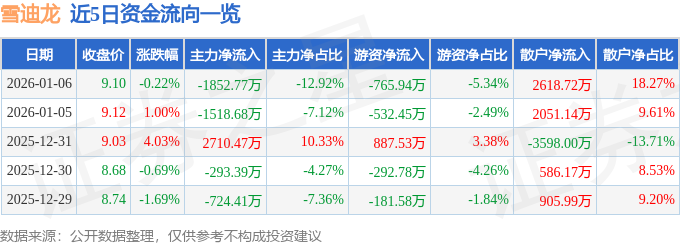 证券之星消息,截至2026年1月6日收盘,雪迪龙(002658)报收于9.1元,下跌0.22%,换手率4.4%,成交量15.78万手,成交额1.43亿元。