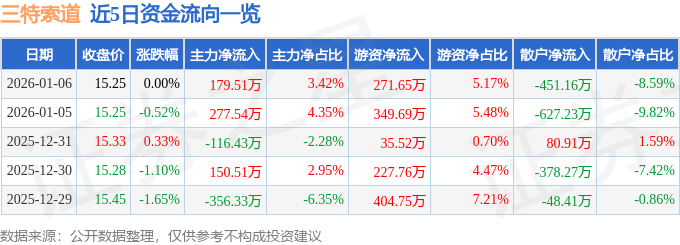 1月6日的资金流向数据方面,主力资金净流入179.51万元,占总成交额3.42%,游资资金净流入271.65万元,占总成交额5.17%,散户资金净流出451.16万元,占总成交额8.59%。