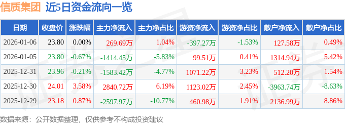 1月6日的资金流向数据方面,主力资金净流入269.69万元,占总成交额1.04%,游资资金净流出397.27万元,占总成交额1.53%,散户资金净流入127.58万元,占总成交额0.49%。