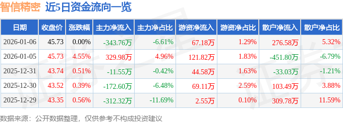 证券之星消息,截至2026年1月6日收盘,智信精密(301512)报收于45.73元,上涨0.0%,换手率4.58%,成交量1.14万手,成交额5201.64万元。