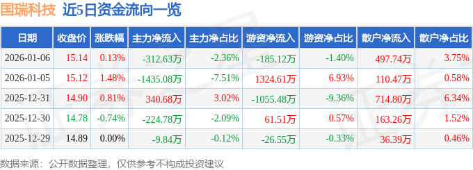 1月6日的资金流向数据方面,主力资金净流出312.63万元,占总成交额2.36%,游资资金净流出185.12万元,占总成交额1.4%,散户资金净流入497.74万元,占总成交额3.75%。