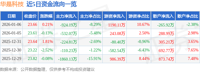 证券之星消息,截至2026年1月6日收盘,华是科技(301218)报收于23.66元,上涨0.21%,换手率6.73%,成交量4.72万手,成交额1.12亿元。