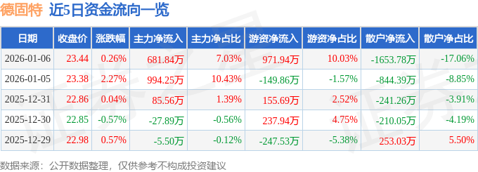 证券之星消息,截至2026年1月6日收盘,德固特(300950)报收于23.44元,上涨0.26%,换手率4.55%,成交量4.14万手,成交额9695.11万元。