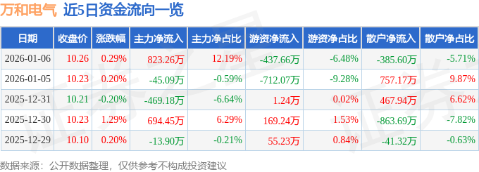 证券之星消息,截至2026年1月6日收盘,万和电气(002543)报收于10.26元,上涨0.29%,换手率1.0%,成交量6.6万手,成交额6754.73万元。